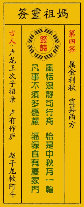| 诗曰 | 风恬浪静可行舟、恰是中秋月一轮、凡事不须多忧虑、福禄自有庆家门。 |