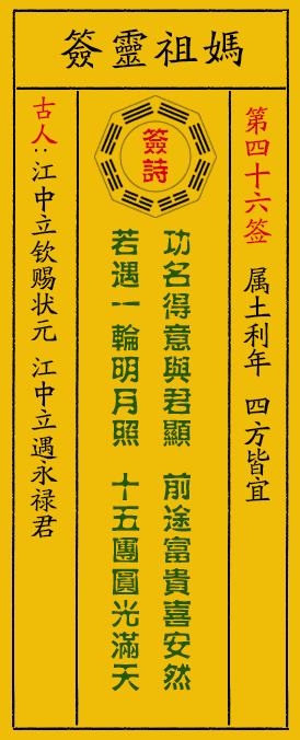 | 诗曰 | 功名得意与君显、前途富贵喜安然、若遇一轮明月照、十五团圆光满天。 |