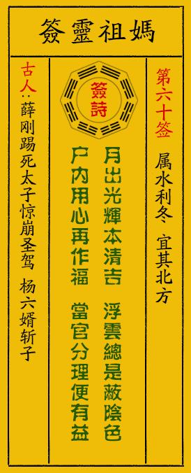 | 诗曰 | 月出光辉本清吉、浮云总是蔽荫色、户内用心再作福、当官分理便有益。 |