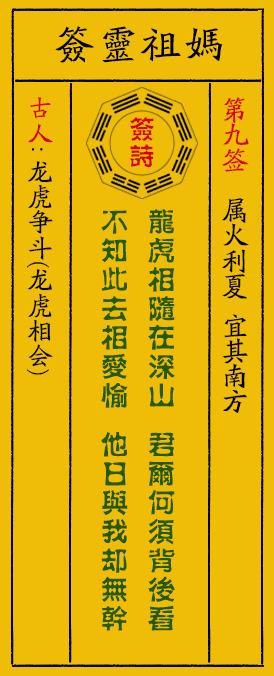| 古人 | 【属火利夏宜南方】【龙虎争斗】龙虎的天性本来就是互相敌对,命运却安排一起住在深山里,劝你只求当下惜缘。其余求神明化解,不须探究现在与未来。因为这种命运安排,本就是一种错误的决定,只恐他日,会变成你我各不相干的局面。 |